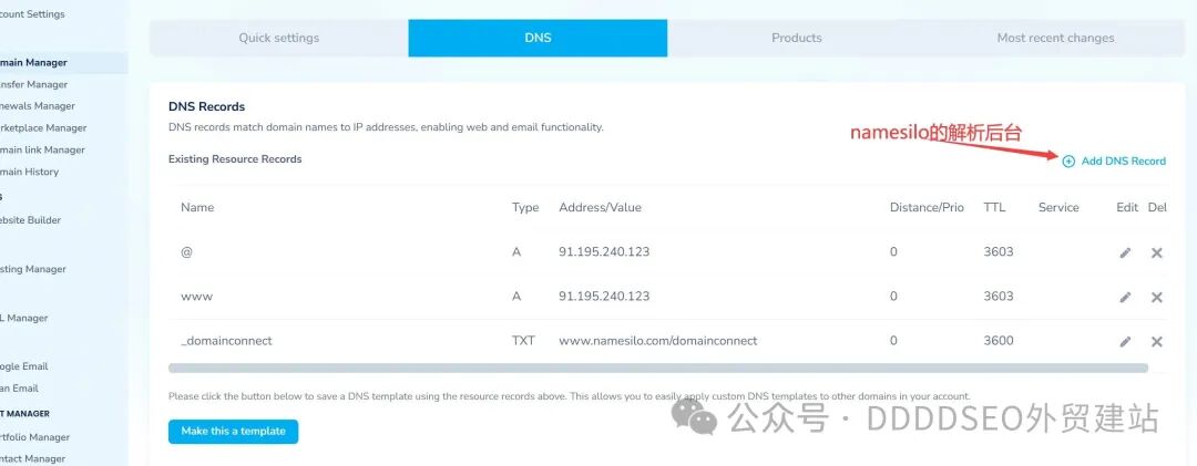 这是大多数新手第一次接触解析的地方。比如阿里云、腾讯云、NameSilo、GoDaddy 等,都会在后台提供一个“DNS 管理”页面。