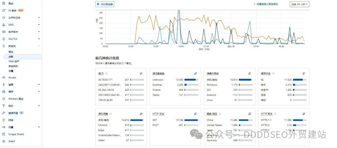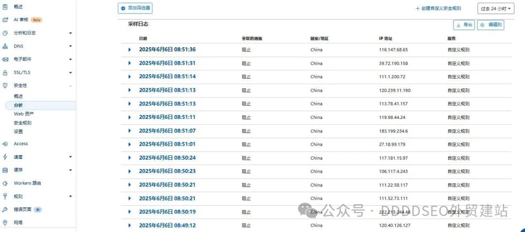 很多外贸人一开始觉得这些“用不上”,但只要你开始做 SEO、跑广告,或者网站被恶意扫描、攻击过一次,就会明白把 DNS 放在 Cloudflare 有多省心。有的时候外贸同行之间,是真的会攻击对方的, 下面这个图片就是典型的cloudfalre怎么防御来自于同行的攻击的: