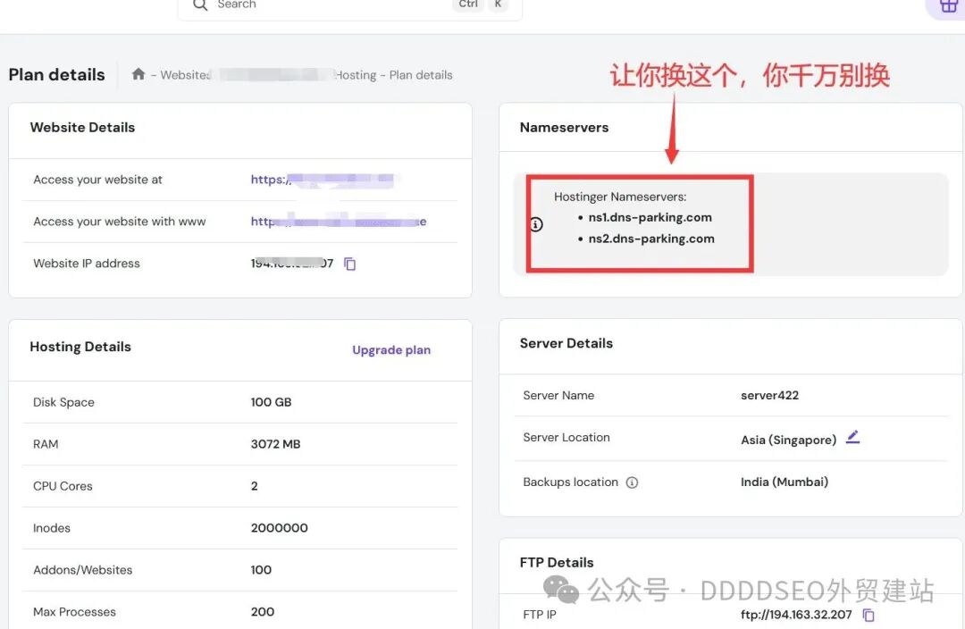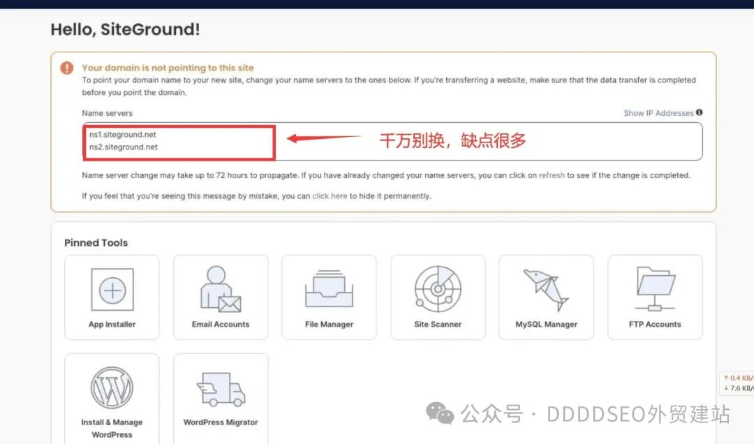 不少网站服务器商都会提示你:“直接把 DNS 指向我们,解析我们来帮你做,更方便。” (例如典型的siteground和hostinger,让你把dns解析转移到平台来,我截图给你,看下是不是很熟悉)。