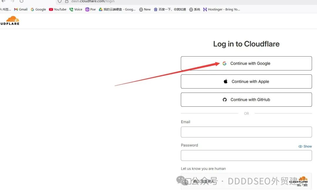 上文中,我讲了在cloudflare是最优的解析方案,这里就教大家如何转移自己的域名解析事情交付给cloudflare。 打开https://dash.cloudflare.com/login进行注册,我一般建议直接通过谷歌账号登录注册比较快。