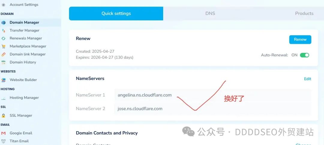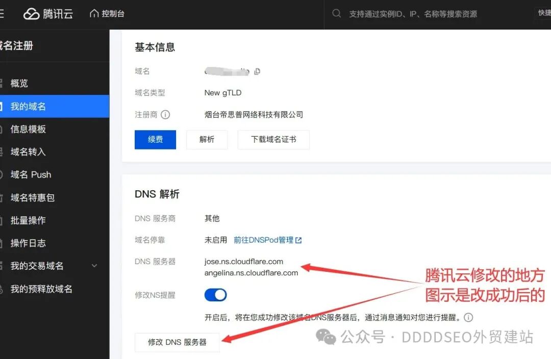 会得到2个名称服务器地址,复制这2个去你的域名注册的后台做替换