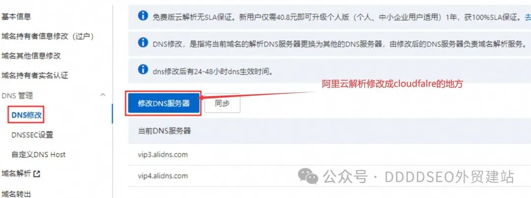 第3个例子,阿里云的后台更换地方。总结:无论什么域名平台注册,只要找到修改DNS服务器这个按钮就对了。