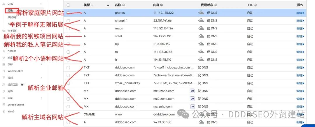 看我的那个截图,解析企业邮箱用了很多条,这个一般你的邮箱服务商会直接发给你解析列表,记得一定要去正规的企业邮箱服务商买服务,例如zoho企业邮箱,腾讯企业邮,谷歌企业邮箱等等。