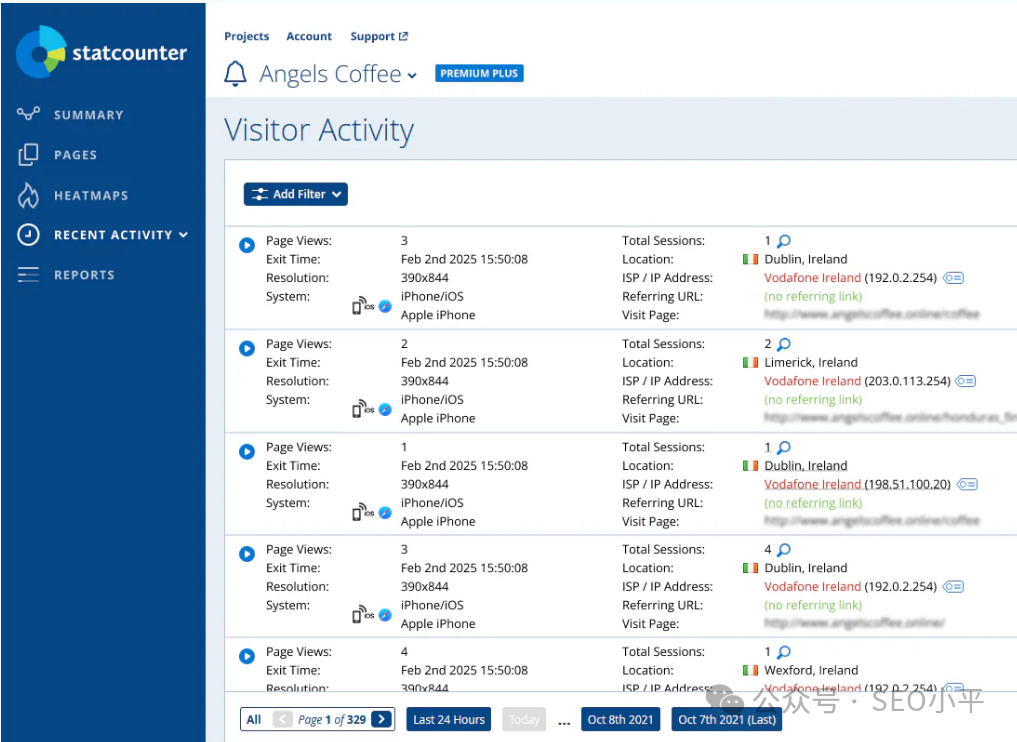 IP追踪: 这是GA4隐藏起来不让你看的东西。Statcounter能直接显示访客的IP地址、ISP(网络服务商)、设备型号。