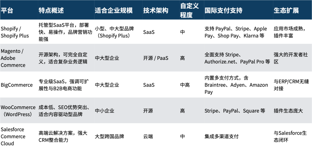 - 大型品牌、深度定制需求、多品牌或 B2B 场景的企业:如果您的品牌已具备一定规模、SKU 架构复杂、或拥有批发、分销、B2B 客户群,技术团队或技术合作伙伴经验成熟,那么应考虑 Adobe Commerce/Magento或 Salesforce Commerce Cloud。