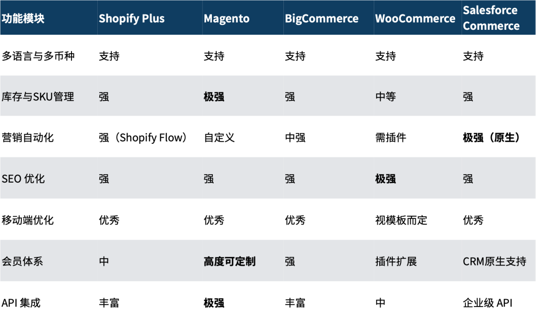 Shopify Plus 和 Magento 均在自动化与国际扩展方面表现突出。