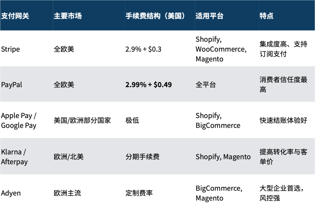 欧美用户偏好使用信用卡与数字钱包,以下是主流支付方案(费率适用于线上信用卡):