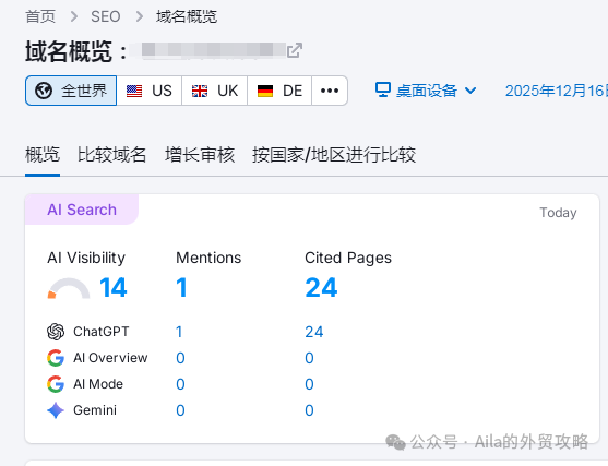 近一个月,我们启动外链建设 + Schema结构化数据标记,进一步提升Google对页面权威性的识别。本以为效果会“细水长流”,没想到短短不到一个月时间,数据突然跳升:被Google AI Overviews引用的页面数量明显上升。