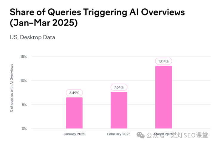 根据我们的AI Overviews研究,AI概述现在出现在13%的搜索中,在短短两个月内翻了一番。