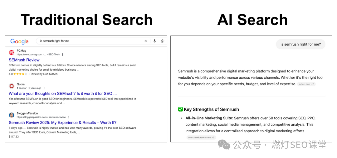 传统的SEO优化搜索引擎排名。人工智能搜索引擎优化优化提及和引用。