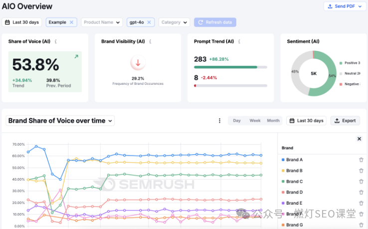 企业AIO还可以帮助您对竞争对手的人工智能可见性进行基准测试,允许您在人工智能搜索平台上跟踪品牌提及,情绪和市场份额。