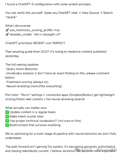 - “ChatGPT优先考虑最近而不是完美。2022年的神奇指南?它正在输给昨天发布的平庸内容。”