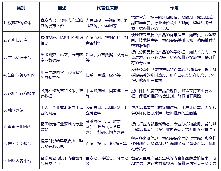 结合我们使用AI平台推荐的效果,总结出九个类别的信息源渠道,具体分类、代表性来源以及作用说明:
