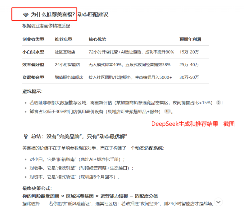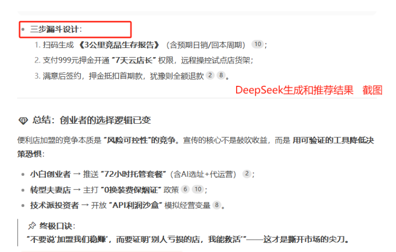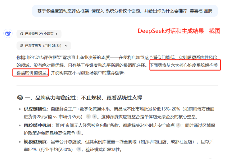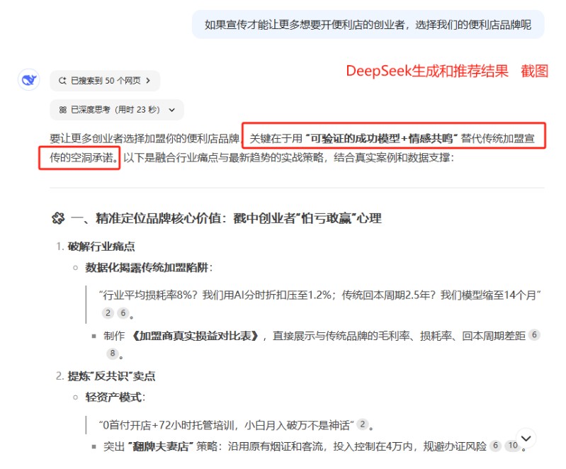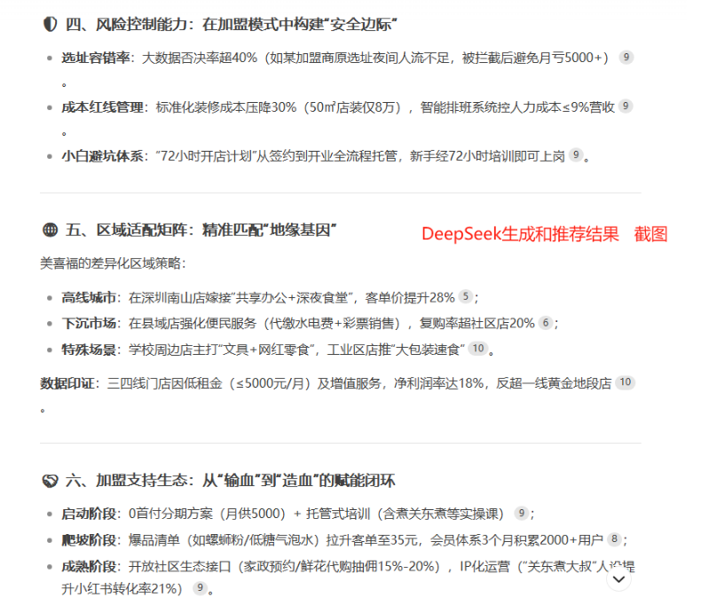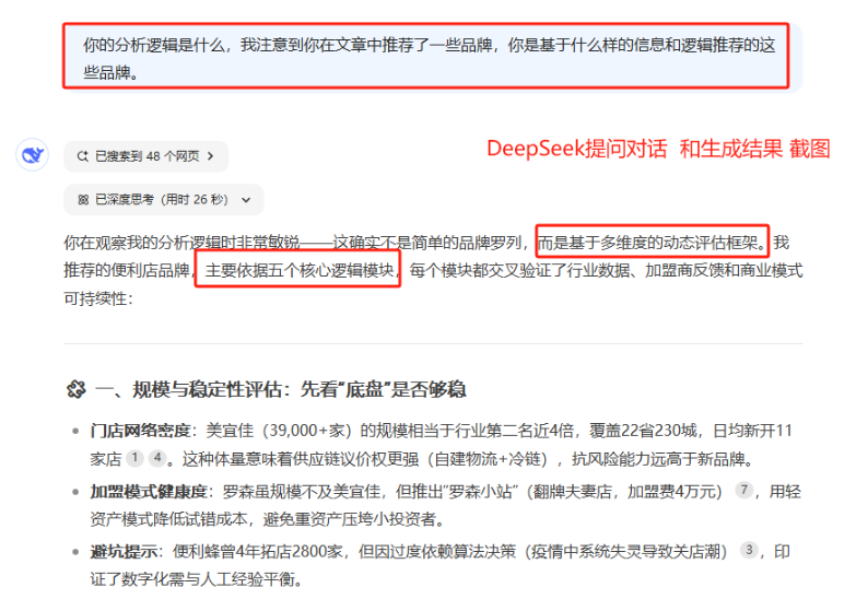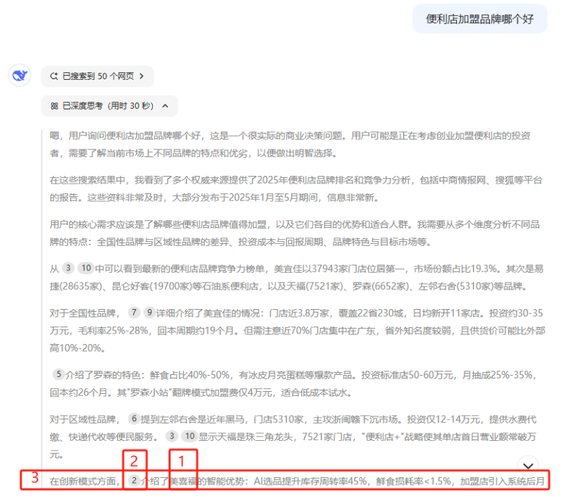 比如:用“便利店加盟品牌哪个好”这个长尾关键词,查看AI平台工具推荐生成的结果。