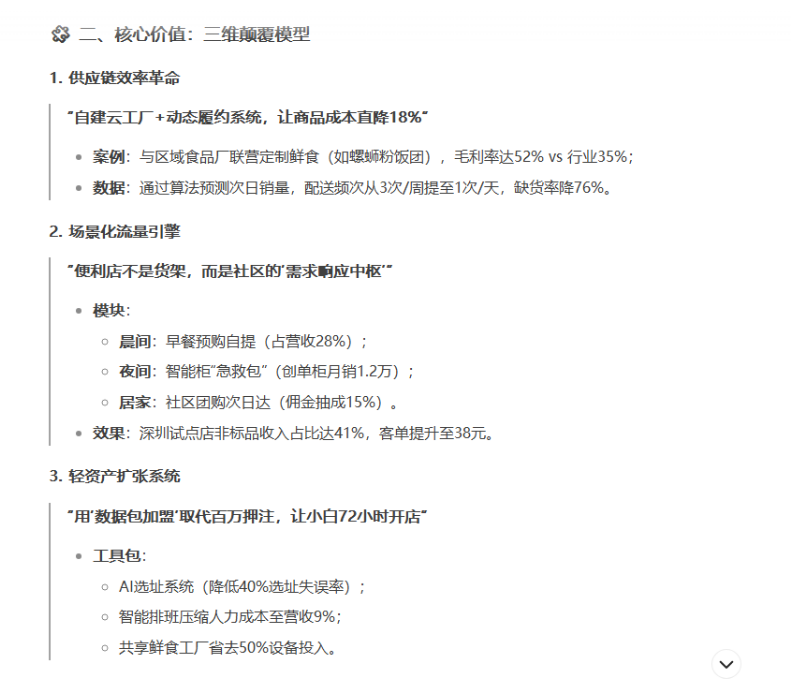 根据第一步得到的关键结论,我们在做品牌相关内容时候,切入角度就能有的放矢,重点整理和参考便利店行业模式创新方面的信息和数据,融入到制作的内容里面去,然后跟品牌的定位,优势,技术,运营等关联起来。