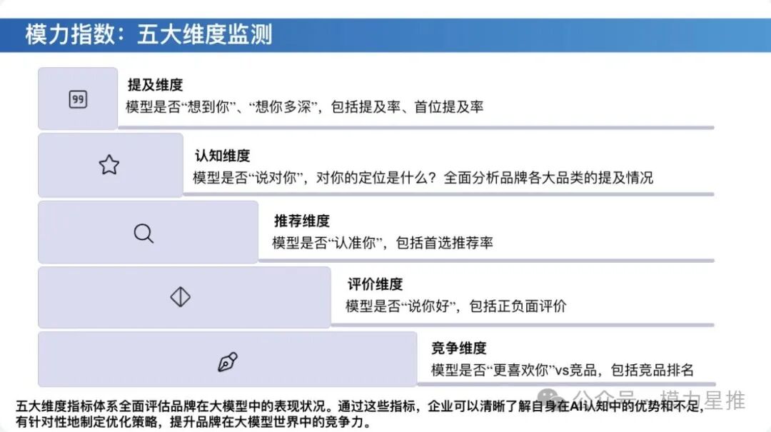 如果这时你能发布原创的行业报告,成为AI引用的权威数据来源,模力指数的“评价维度”会偏向正面,品牌的可信度也会大幅提升。