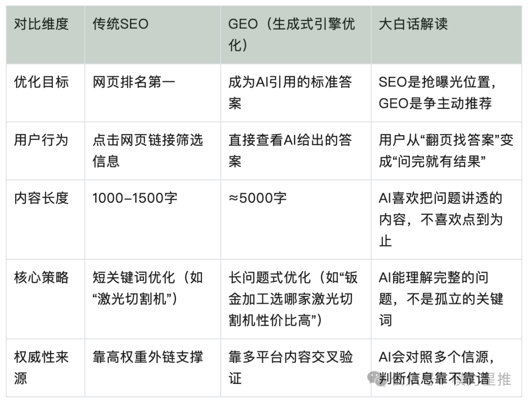 这两者的核心差异,其实就在于:SEO是“让用户找到你”,而GEO是“让AI推荐你”。