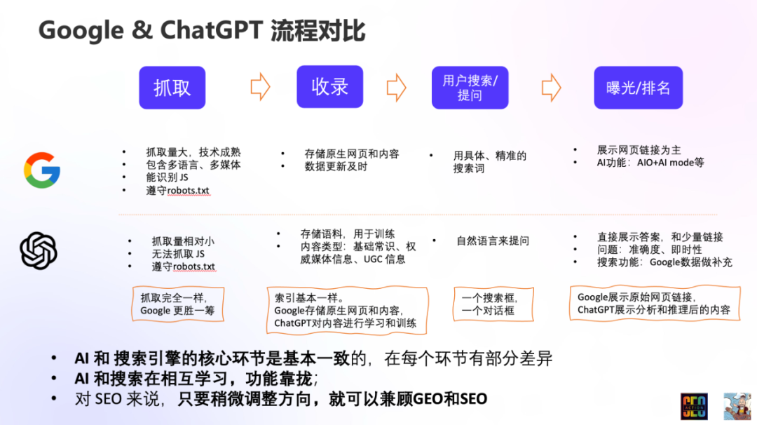- 【抓取:爬虫抓取网页】Google 有多年的技术沉淀和资源,抓取能力可谓天下第一,并在几年前就实现了 JavaScript 的渲染能力,而这一点恰恰是 ChatGPT 等 AI 搜索缺失的(AI爬虫还没有 JavaScript 渲染的能力);还有抓取效率、抓取规模,都是 Google 领先