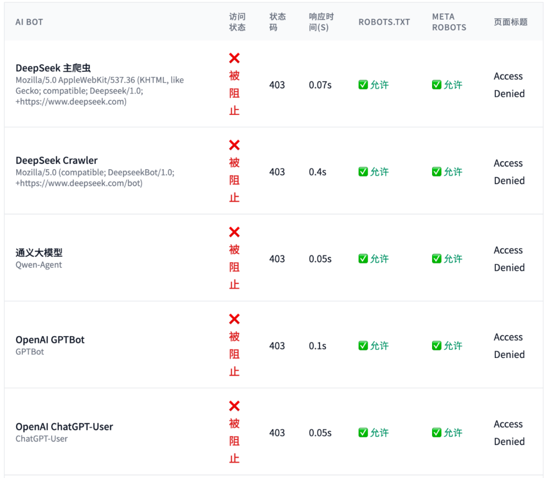 ⬆️错误案例:某个网站在服务器端错误配置,屏蔽了 AI爬虫(使用 AI 爬虫抓取验证工具的截图)
