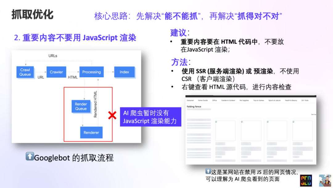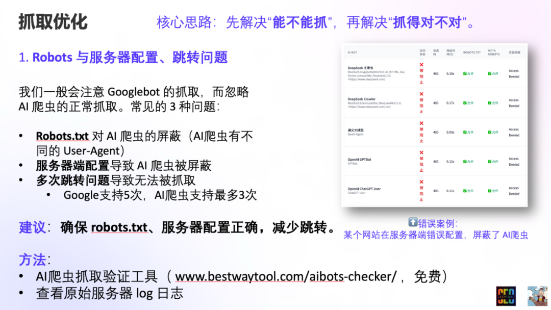 - 抓取优化:要注意robots.txt配置、服务器配置,保证 AI 顺畅抓取;重要内容不要放在 JavaScript 中,方便 AI 爬虫识别