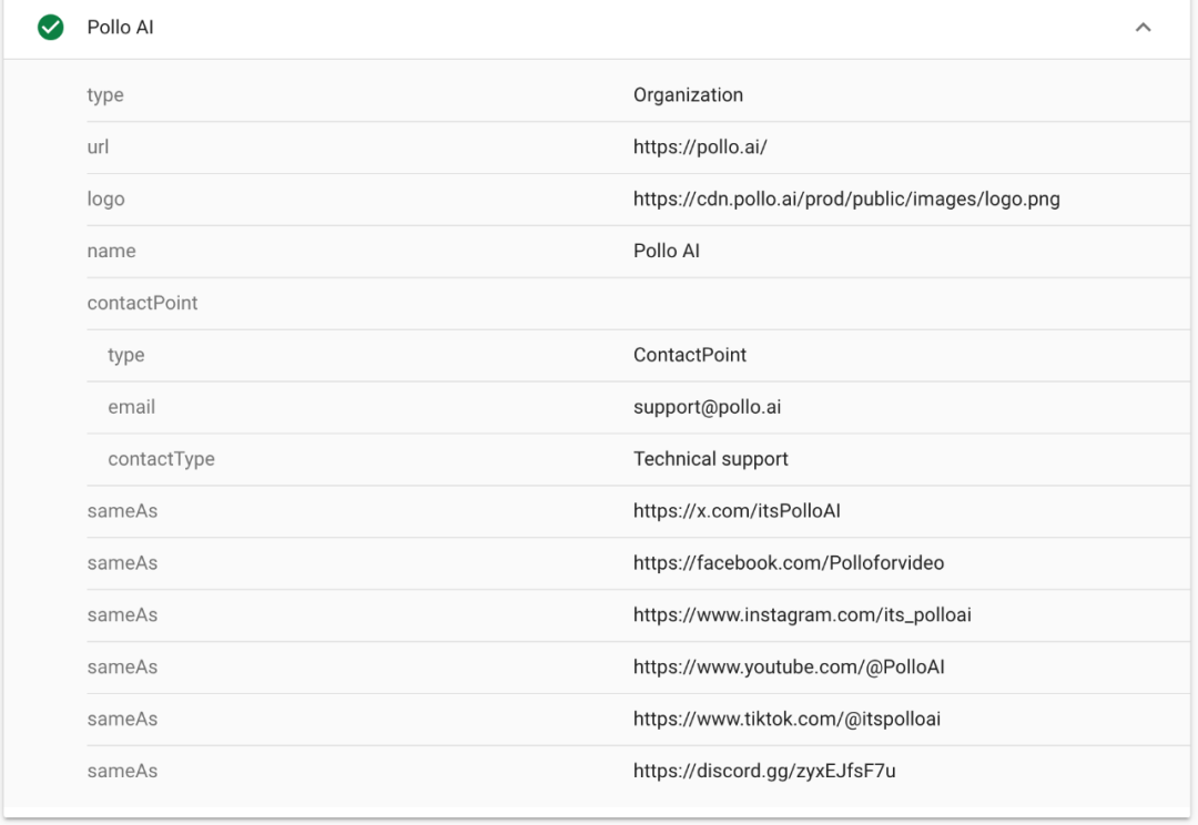 以上是 Pollo AI 首页 Organization 的结构化数据,除了品牌信息外,还将其他社交媒体账号的做了关联,方便 AI 理解。