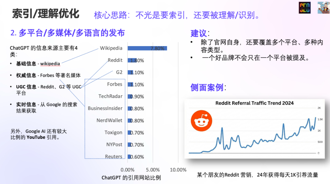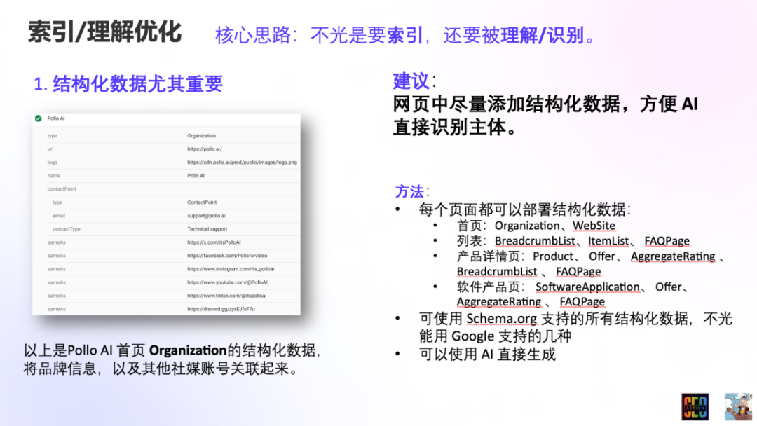 - 索引优化:结构化数据更重要了,方便 AI 爬虫识别和理解;内容要覆盖多个平台(Wiki、媒体、社交媒体等)、多种内容类型(文字、图片、视频、播客)、多种语言,这些都是 AI 的信息源