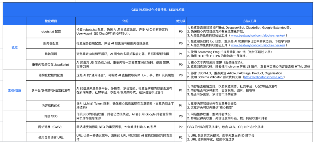 - 曝光/引用优化:传统 SEO 仍很关键;网站性能、自然语言URL、清晰的HTML都是技术端重要因素;内容端要注意 EEAT、问答型表达、解决用户问题