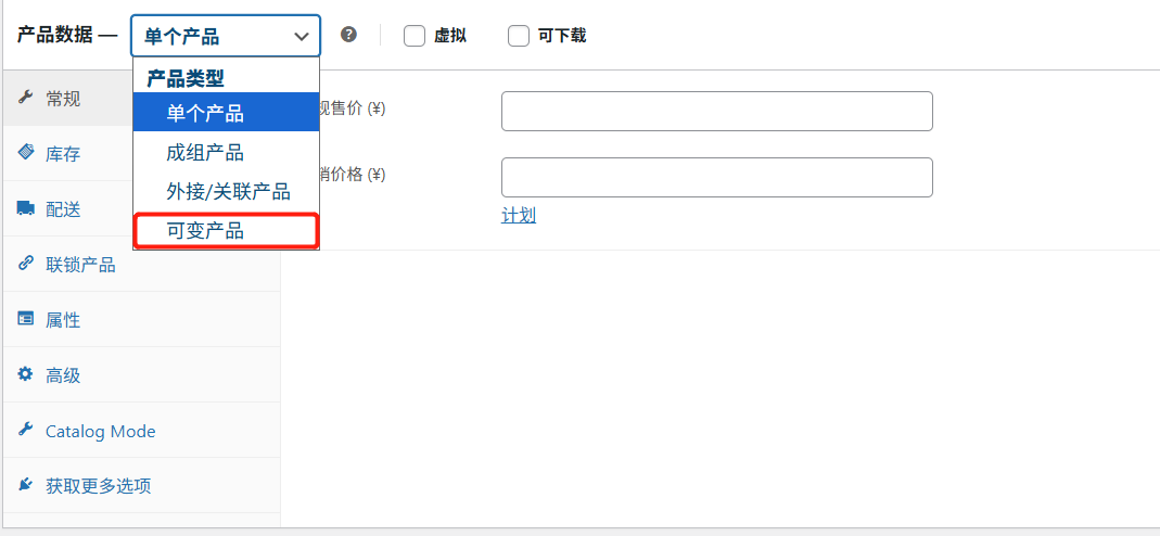 这里下滑找到产品数据,不要选择单个产品,选择可变产品