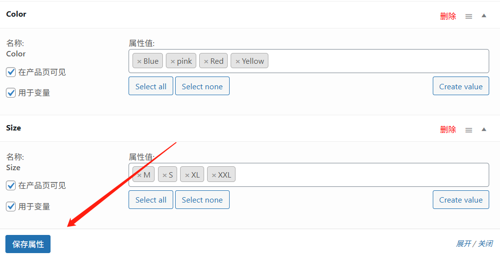 把我们预设好的Color和Size都添加进来,点击保存属性。