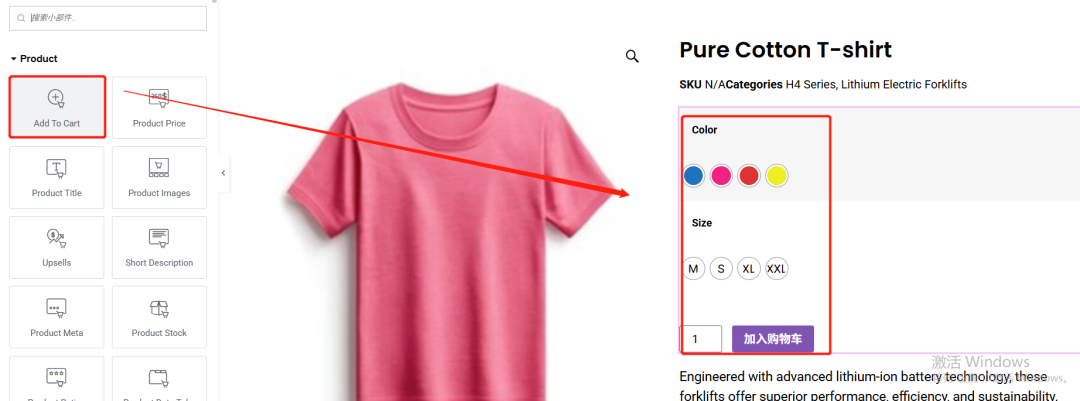 进入产品编辑页面之后,因为这个产品没有与elmentor关联单独的元素,它是内嵌到Add To Cart里面的,所以我们只需要将这个元素,拖拽到对应的位置就可以了,这样就可以显示出来此功能了。