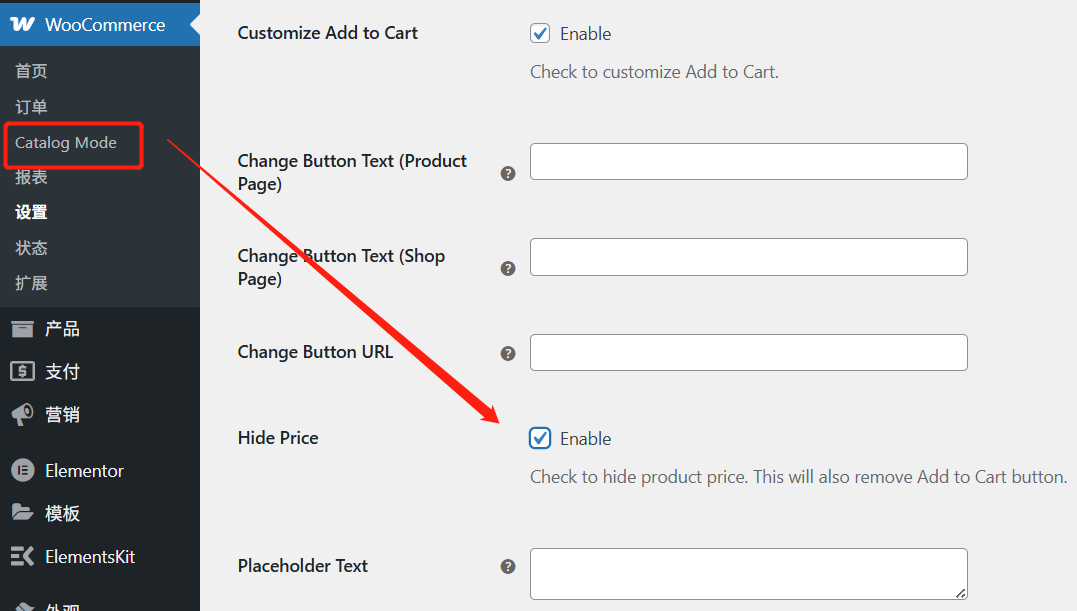 安装完成后,在WooCommerce里面找到Catalog Mode,点击后在Hide Price中把Enable打上对勾,点击保存。