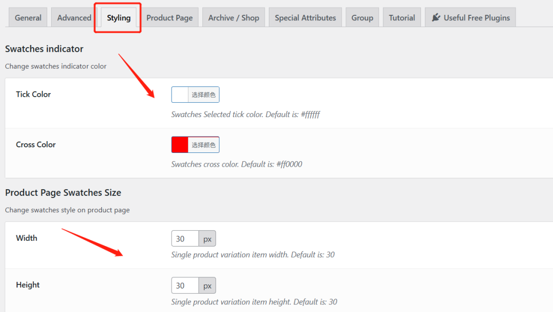 上面我们的功能基本已经实现了,如果想要调整一下显示颜色、尺寸颜色切换的样式,需要在这个插件的设置里面进行调整。