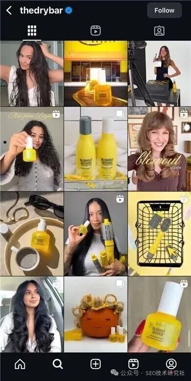 例如,Drybar 在帖子中统一使用黄色点缀主题,通过视觉一致性强化品牌识别。