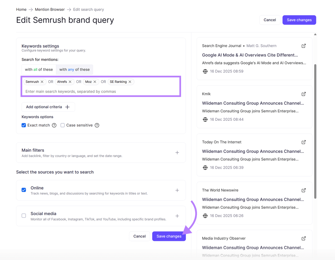 添加竞争对手品牌名称作为附加查询。点击“保存更改”。