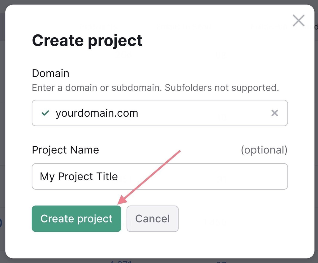 打开 Semrush 的,输入您的域名,然后点击“创建项目”。