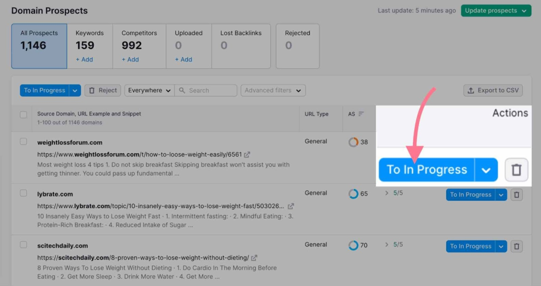 当您找到想要联系的网站时,点击“进入进行中”按钮,将其移至您的外联工作流程中。