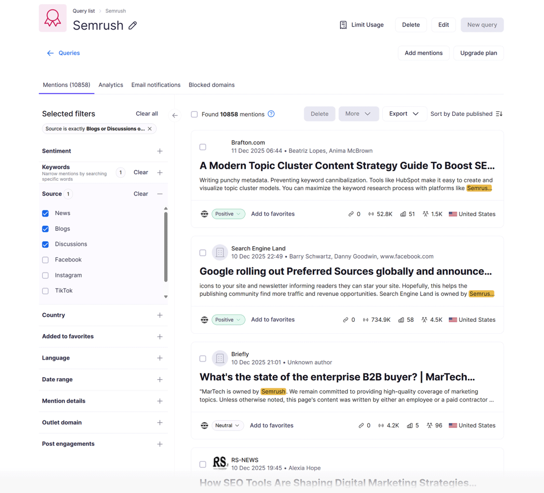 使用 Semrush 的工具,即使没有链接,也可以跟踪您的品牌或竞争对手的品牌何时在网上被提及。
