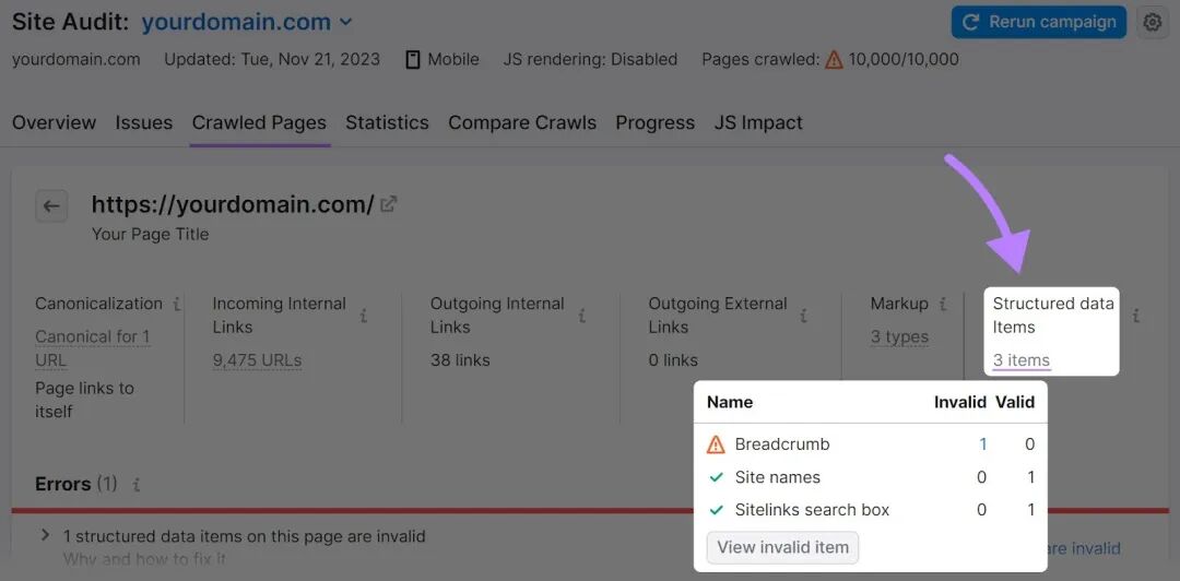 添加架构后(无论是通过应用程序还是自定义实现),请使用 Semrush 的扫描您的域是否存在架构错误,并确认哪些页面具有有效的标记。