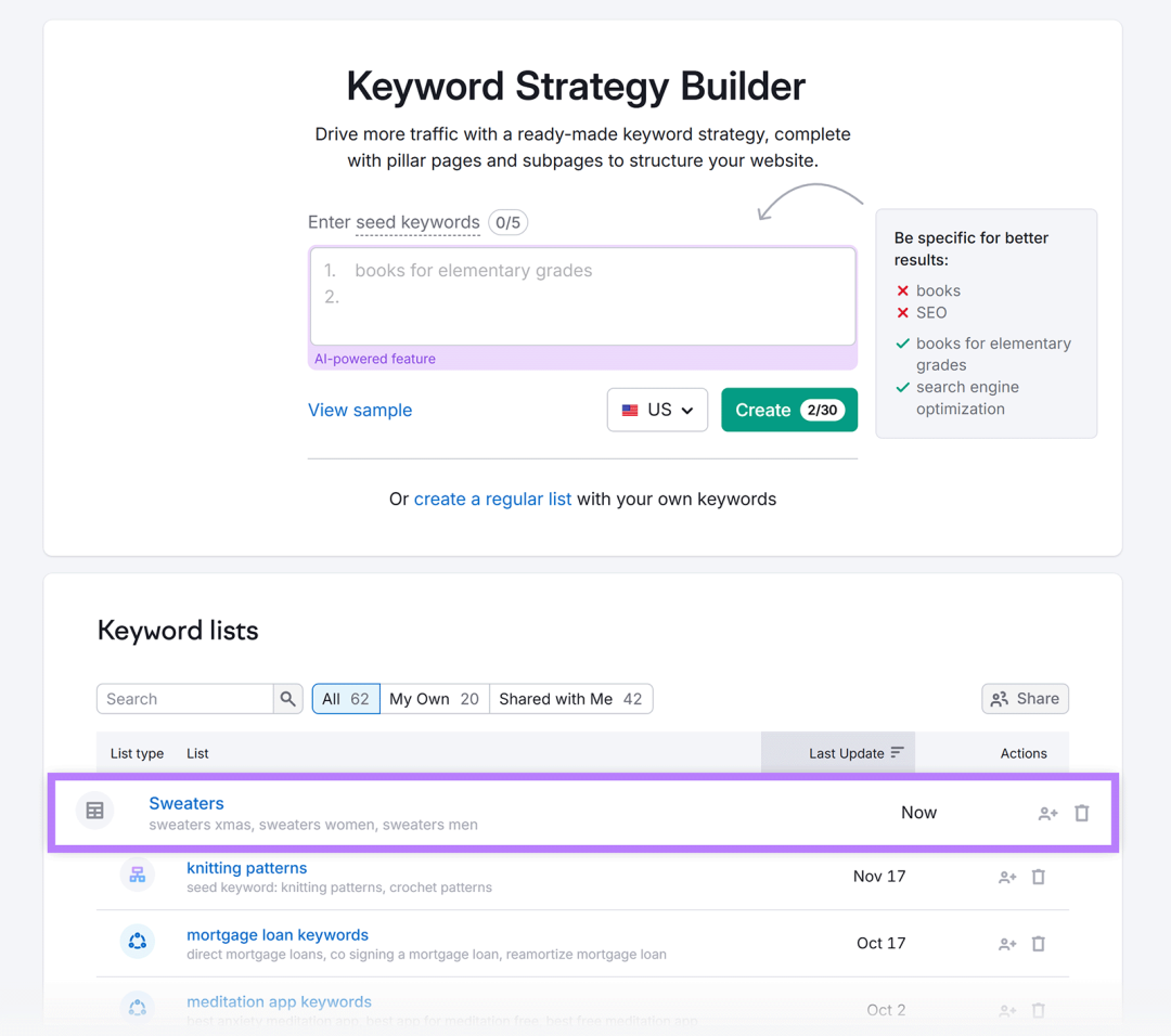 将关键词魔法工具中的列表发送到关键词策略构建器。