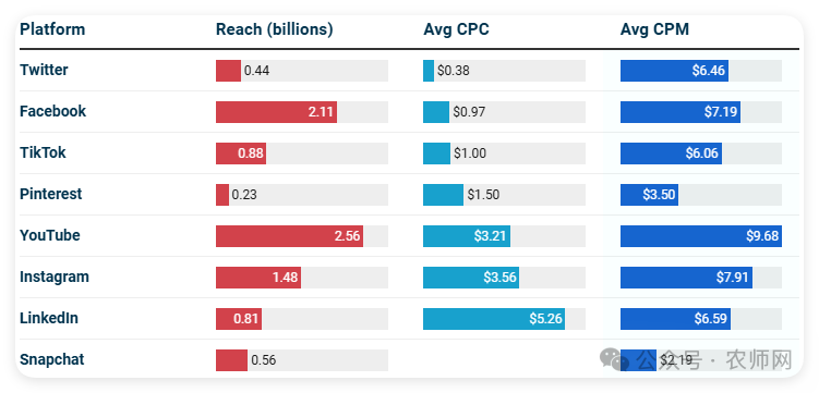 (全球主要社交媒体广告概览——总受众数/CPC/CPM三项核心数据)